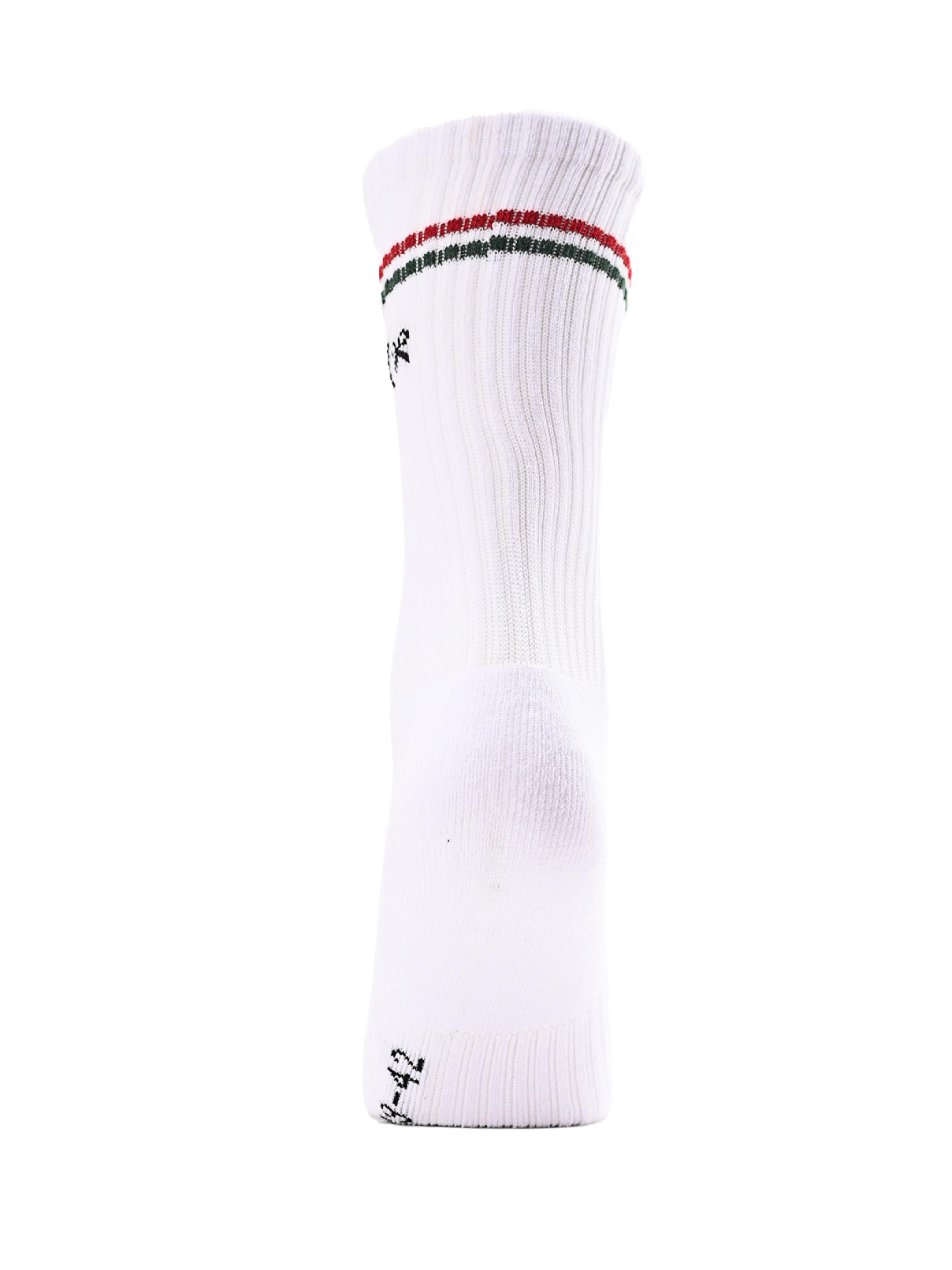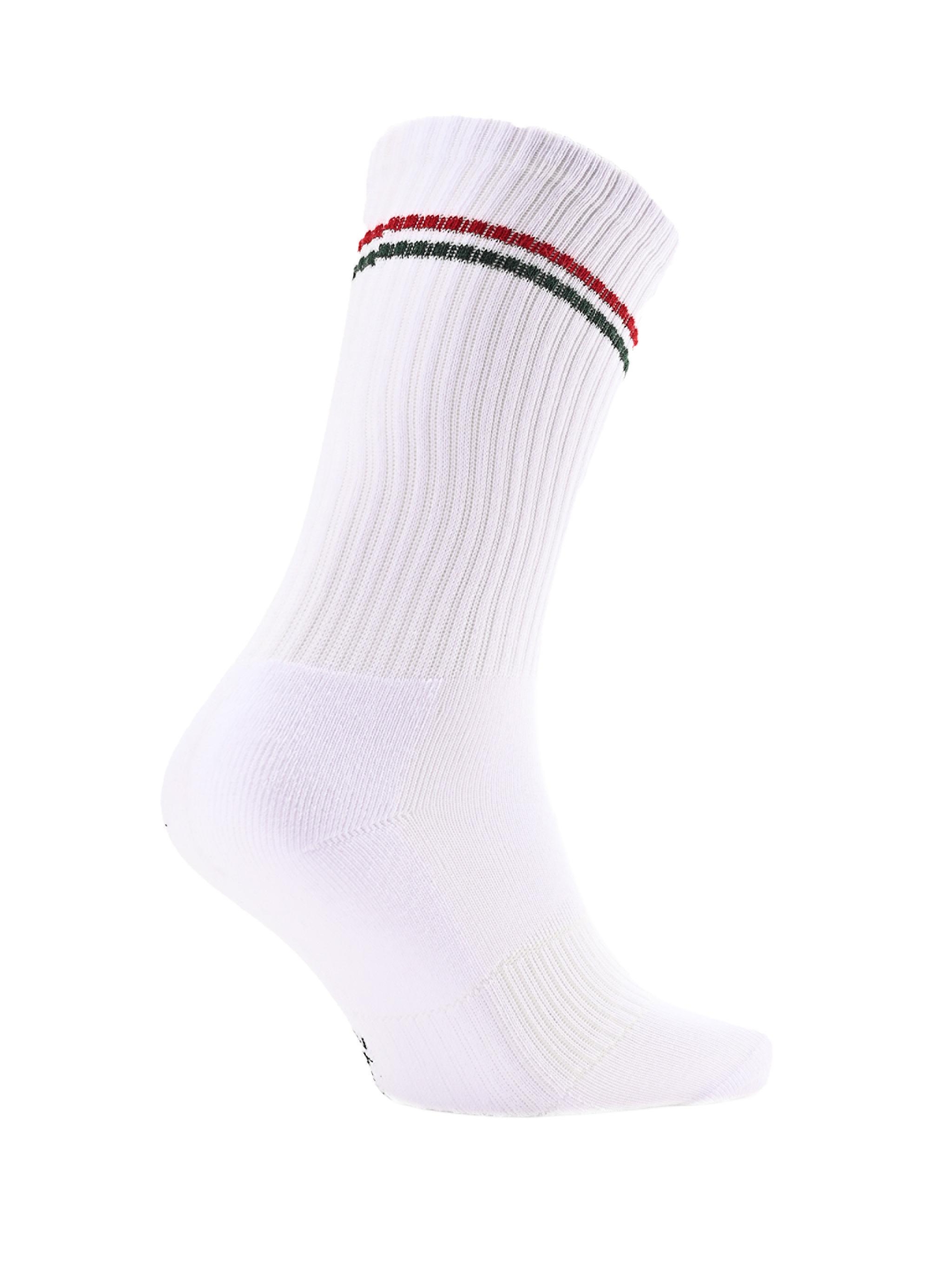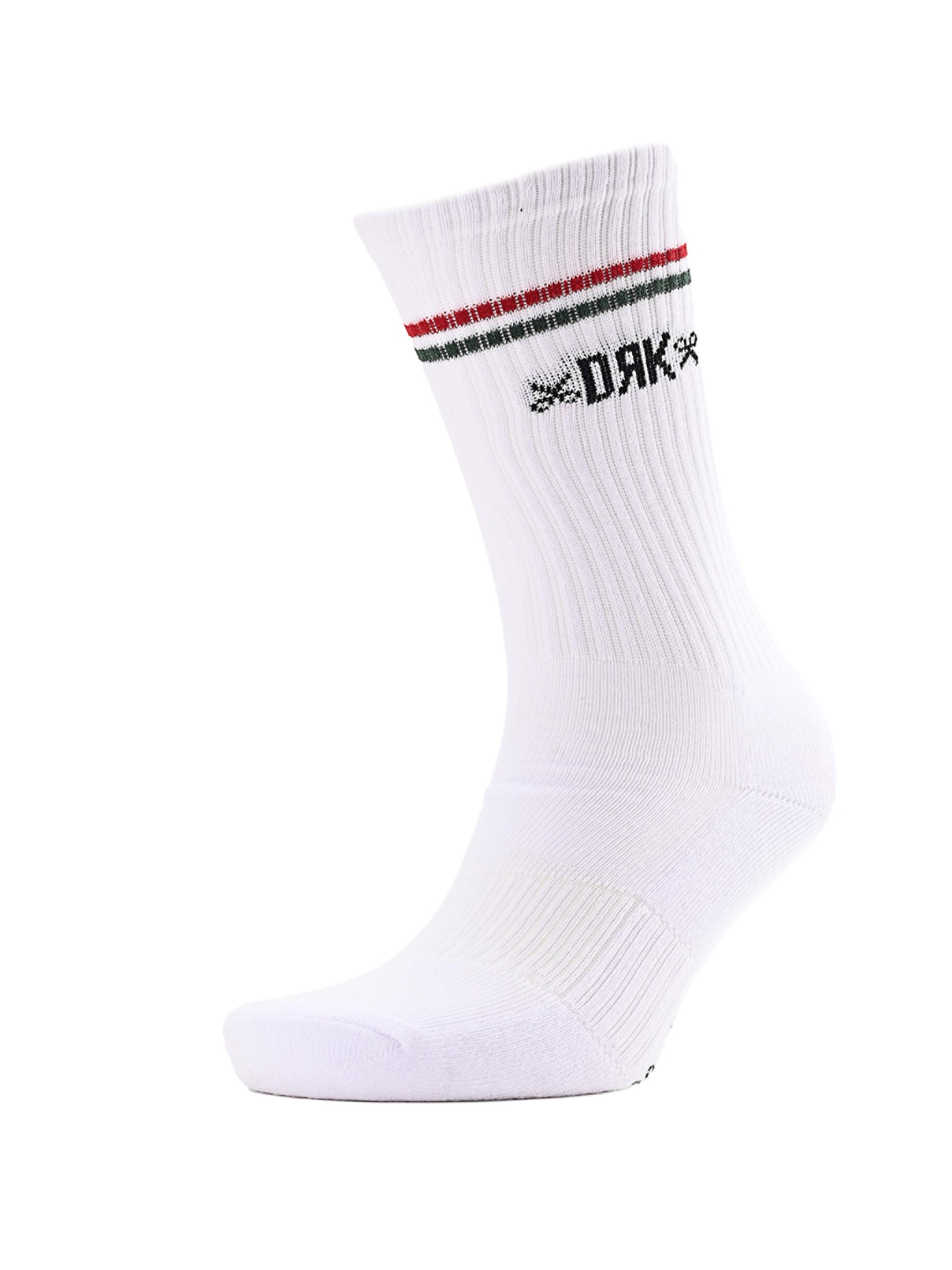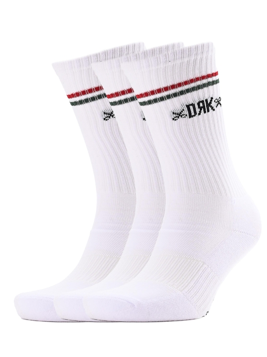 Aceste șosete albe DRK sunt decorate cu dungi roșu-alb-verde inspirate din tricolorul maghiar, oferind un look sport și stilat în același timp. Tija elastică, ribată, asigură o fixare confortabilă, iar materialul din amestec de bumbac garantează ventilație și confort pe tot parcursul zilei. Sunt alegerea perfectă pentru antrenamente, outfituri urbane sau pentru purtarea zilnică, atunci când vrei să îți exprimi și mândria națională prin stilul tău.