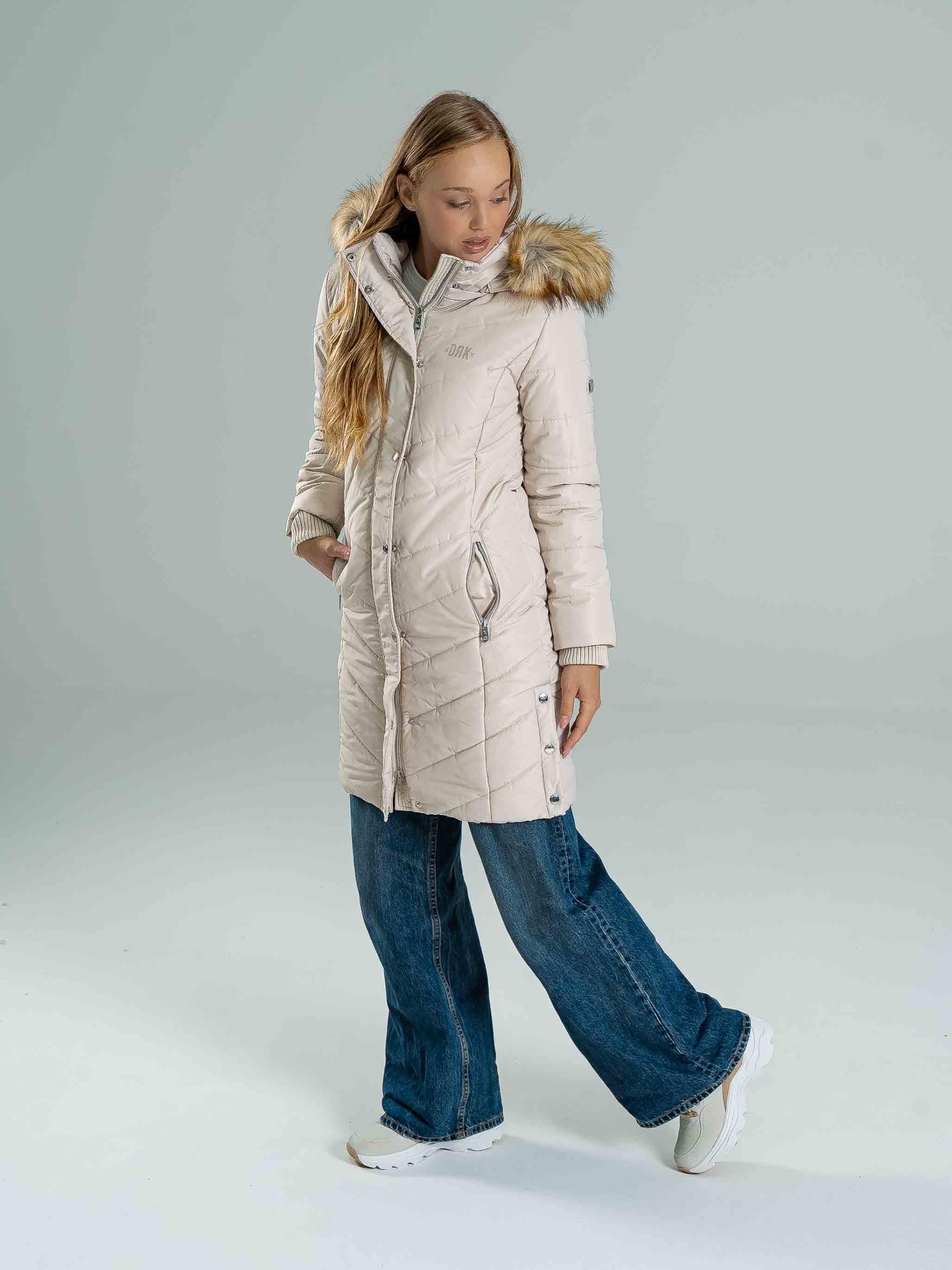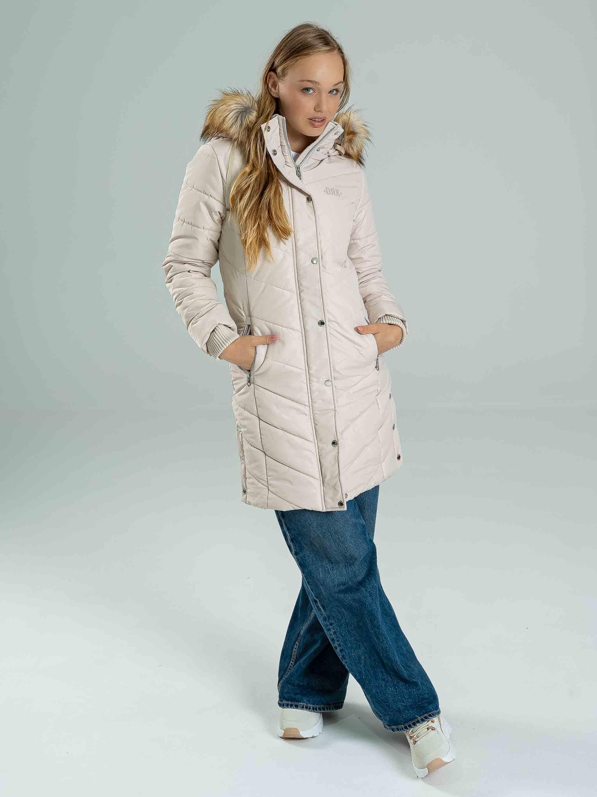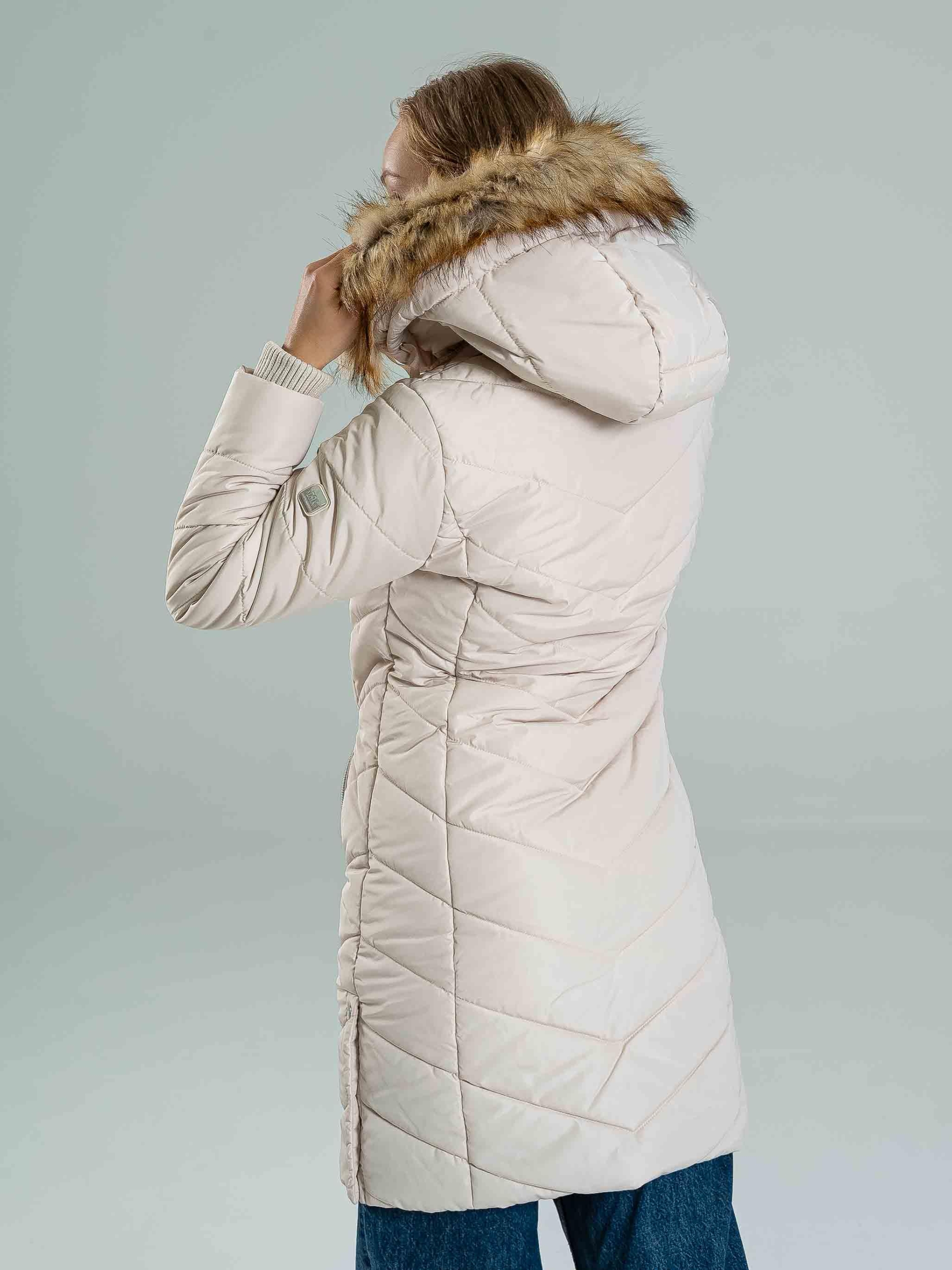 Geaca NENA este un model de iarnă călduros, cu croială cambrată, perfect pentru sezonul rece. Este realizată din 100% poliester, fiind ușoară, dar oferind o izolație excelentă. Logo-ul lucios din cauciuc, logo-ul metalic de pe brațul stâng, precum și nasturii și fermoarul personalizate cu logo conferă un aspect modern și premium. Gluga detașabilă cu blană permite adaptarea stilului, iar manșetele tricotate sporesc confortul și oferă protecție suplimentară împotriva frigului. Modelul are 174 cm și poartă mărimea S.