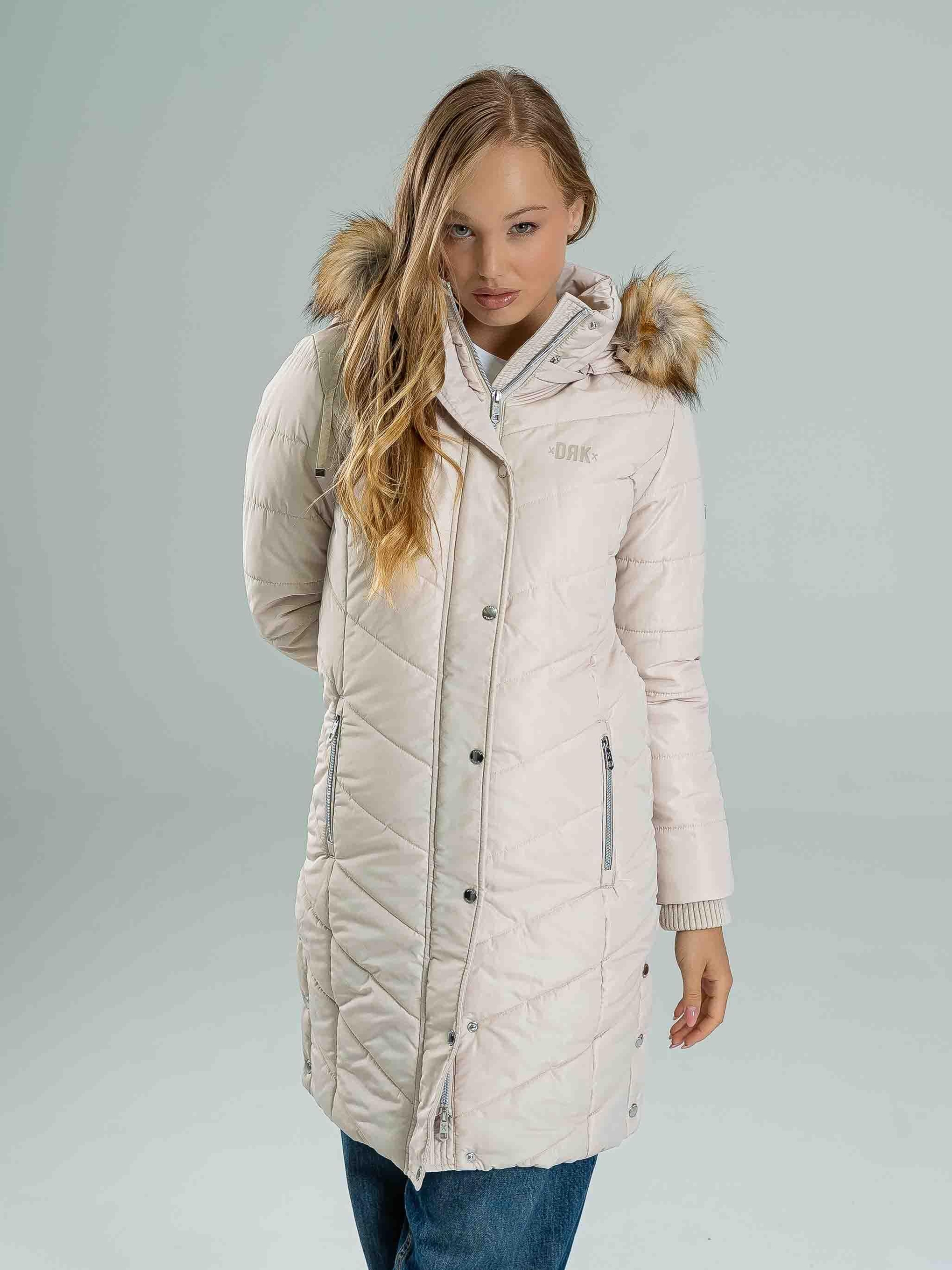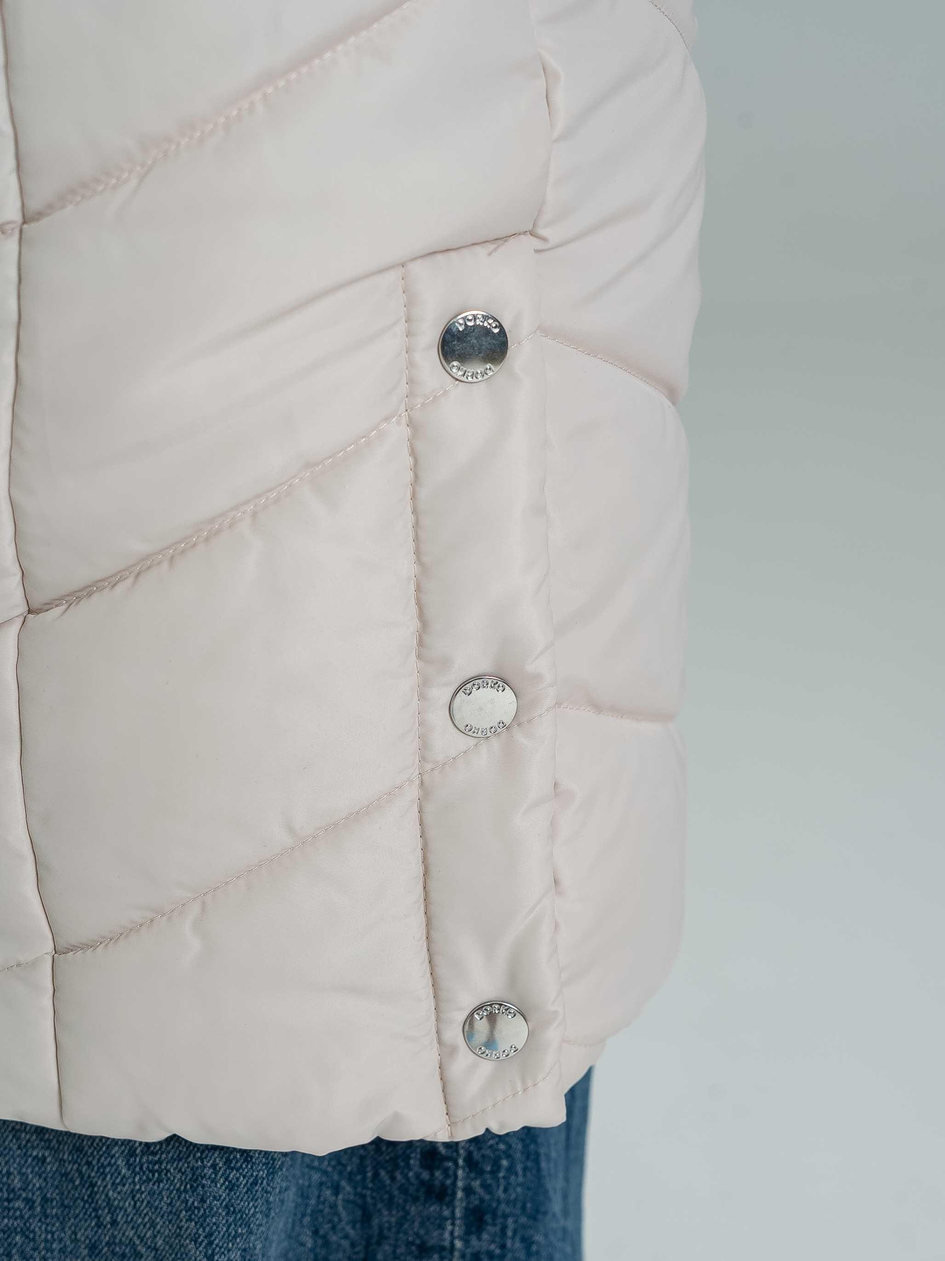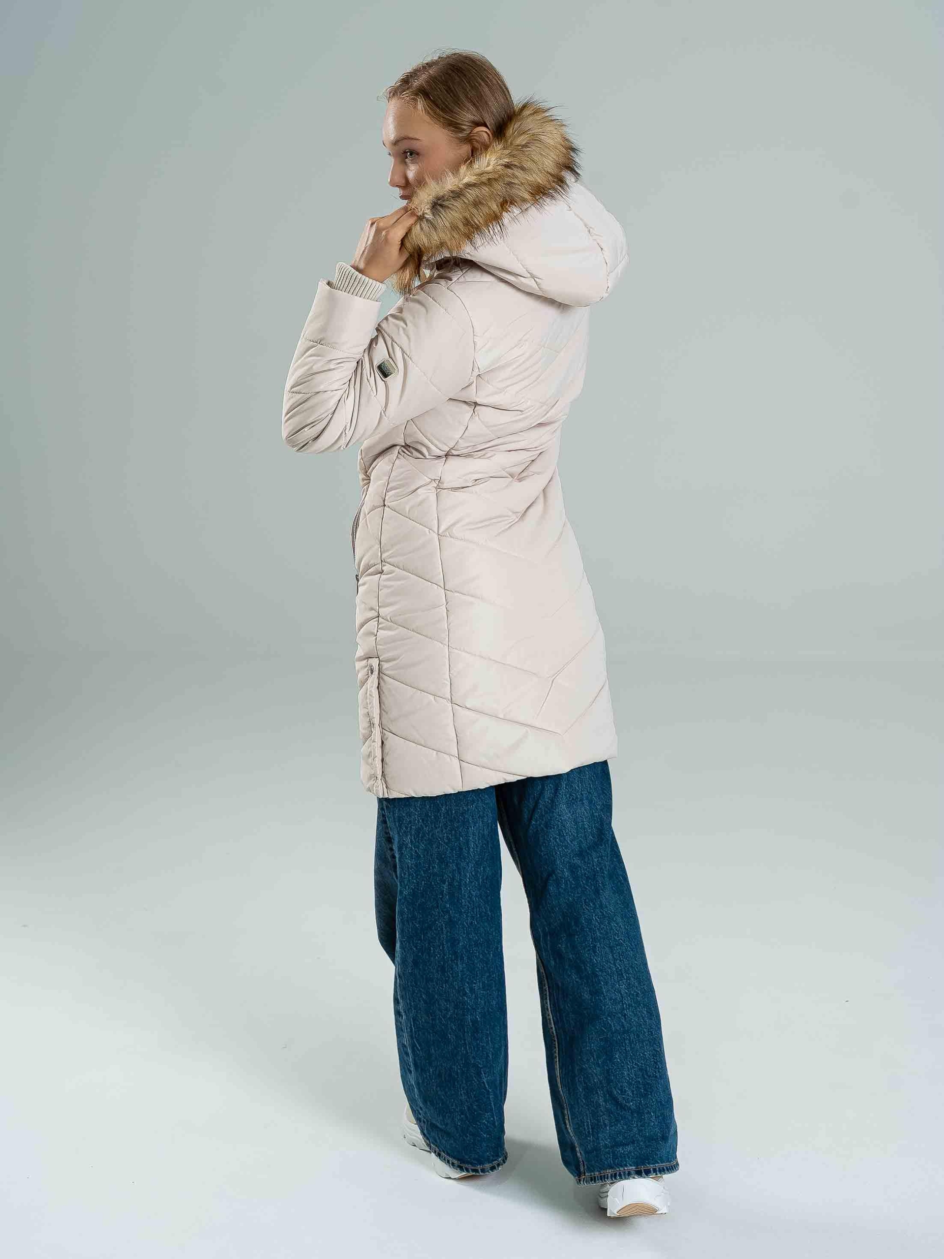 Geaca NENA este un model de iarnă călduros, cu croială cambrată, perfect pentru sezonul rece. Este realizată din 100% poliester, fiind ușoară, dar oferind o izolație excelentă. Logo-ul lucios din cauciuc, logo-ul metalic de pe brațul stâng, precum și nasturii și fermoarul personalizate cu logo conferă un aspect modern și premium. Gluga detașabilă cu blană permite adaptarea stilului, iar manșetele tricotate sporesc confortul și oferă protecție suplimentară împotriva frigului. Modelul are 174 cm și poartă mărimea S.